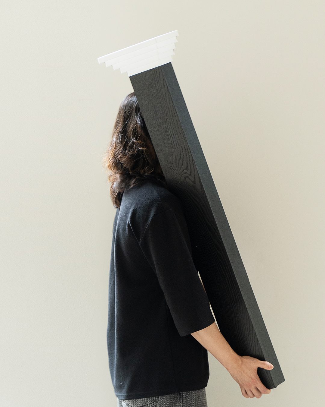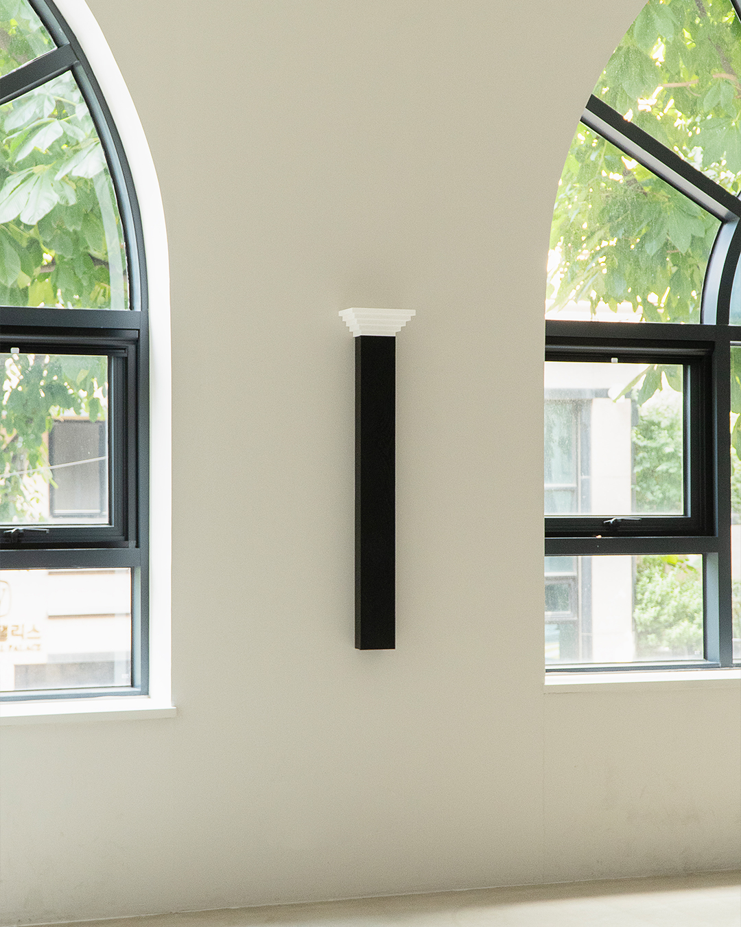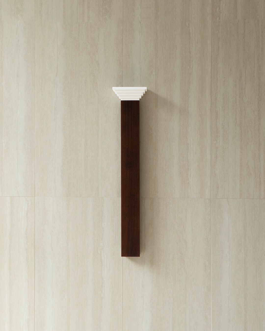 따뜻한 결을 지닌 원목 기둥 위로 디지털 레이어의 조형이 적층되며 은은한 빛을 머금습니다.